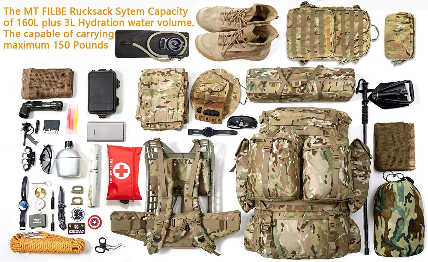 FILBE Hiking Bag&BackPacks Sysgtem with Assault&Hydration Backpack, Tactical Backpack External Poly Frame, Multicam